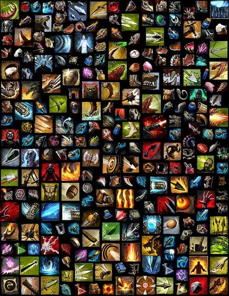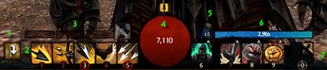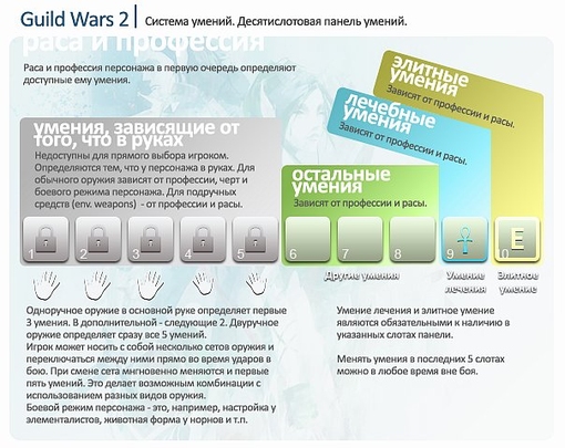 | Оружие Список стандартного экипируемого оружия: - Одноручное: Топор, даггер, булава, пистолет, скипетр и меч. - Двуручное: Большой меч, молот, длинный лук, ружье, короткий лук и посох. - Офф хенд: фокус, щит, факел и боевой рог. Не все профессии смогут использовать все оружие, и некоторые профессии получат возможность использовать больше оружия, чем остальные. Оружие, которое взято во вторую руку будет иметь различный набор умений, как если бы оно было использовано в основной руке. Не все профессии смогут использовать оружие во второй руке. Подручные объекты также смогут быть использованы как оружие, и у них будет свой набор умений, который различается в зависимости от профессии, их использующей. Как пример: Броня и одежда Тип доспехов, которые одевает игрок, зависит от профессии персонажа: * Ученые будут носить Легкие доспехи * Авантюристы будут носить Средние доспехи * Солдаты будут носить тяжелые доспехи Игроки получат возможность красить свои доспехи, а также они смогут отобразить 3 отличных оттенка на каждой части доспеха. В демо улучшение для доспеха было получено как награда за событие. Похоже, что система получения улучшений аналогична системе эмблем из Guild Wars 1, но вместо одного улучшения для одной части доспеха их несколько. Как было заявлено, если НПЦ носит какую-нибудь одежду, то, вероятно, и игрок сможет ее носить. Еще никто не обсуждал, как будет работать броня, но, похоже, что социальный вид одежды возможен. Бой Бой в Guild Wars 2 построен вокруг повреждений, контроля и помощи. Повреждения просто уменьшают здоровье противника, контроль предупреждает действия врага и помощь состоит из стимулирования способностей союзников. Каждая профессия может выполнять любую из этих ролей. Тактика боя будет зависеть от передвижений, получения позиционного преимущества и использования кросс-профессионных комбинаций. В бою можно будет использовать много подручного оружия, разбросанного по миру, начиная от камней, которые можно бросить во врага, и заканчивая банками с пчелами. Некоторое подручное оружие будет иметь разные эффекты в зависимости от профессии, которая их использует. Body blocking может быть продублировано только через использование умений, поскольку в Guild Wars 2 не будет системы столкновений между персонажами. Игроки смогут уклониться от атак и снарядов. Некоторые умения получат тактические преимущества, если их использовали сбоку или сзади от оппонента, другие – будут направленными или АоЕ, или даже смесью обоих, что говорит о важности позиционирования. Интерфейс Все, что мы знаем об интерфейсе, взято из демо-роликов с gamescom’а. Разработчики начали с того, что он все еще находится в процессе доработки, и в игре будет присутствовать возможность изменения интерфейса пользователем. Информация по интерфейсу может рассматриваться только как «черновая». Панель умений 1. Сменить комплект оружия 2. Оружейные умения (первые три для основной руки, последние два – для второй руки, или все пять для двуручного оружия) 3. Полоска «набора», зависящая от профессии. У воинов она отвечает за набор адреналина, у некроманта – за набор жизненной силы. 4. Жизни 5. Зелья энергии 6. Полоска энергии 7. Пять слотов для расовых или профессиональных умений, умения лечения и элитного умения. Описание системы десятислотовой панели умений