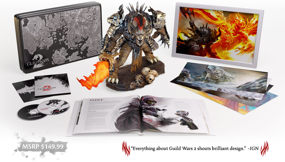 С 10 Апреля можно будет оформить предварительный заказ https://buy.guildwars2.com/ Будет доступны три предложения: - Digital Edition $59,99 является базовым вариантом покупки с общими для всех изданий бонусами в виде доступа ко всем бета-ивентам, 3 дней раннего доступа (Headstart) и предметом Hero’s Band (бонус к первичным характеристикам, урону от состояний/критических повреждений и эффектности лечения) - Digital Deluxe $79,99 добавит к этому набору элитное умение для временного вызова боевого пета Mistfire Wolf, миниатюрную внутриигровую копию Rytlock Brimstone, персонального голема-банкира для доступа к хранилищу из любой точки мира, разовый бонус к Славе в PvP при использовании Chalice of Glory, разовый бонус к Влиянию гильдии при использовании Tome of Influence - Collector's Edition $149,99 призвано удовлетворить чаяния настоящих фанатам. К преимуществам двух предыдущих изданий добавится 10-дюймовая фигурка Rytlock Brimstone для украшения реального дома игрока, 112-страничная книга с любопытными фактами о создании игры, интервью и концепта-артом, рамка для творений самого игрока (Art Frame), 5 высококачественных репродукций из портфолио художников ArenaNet и CD с лучшими музыкальными треками из игры